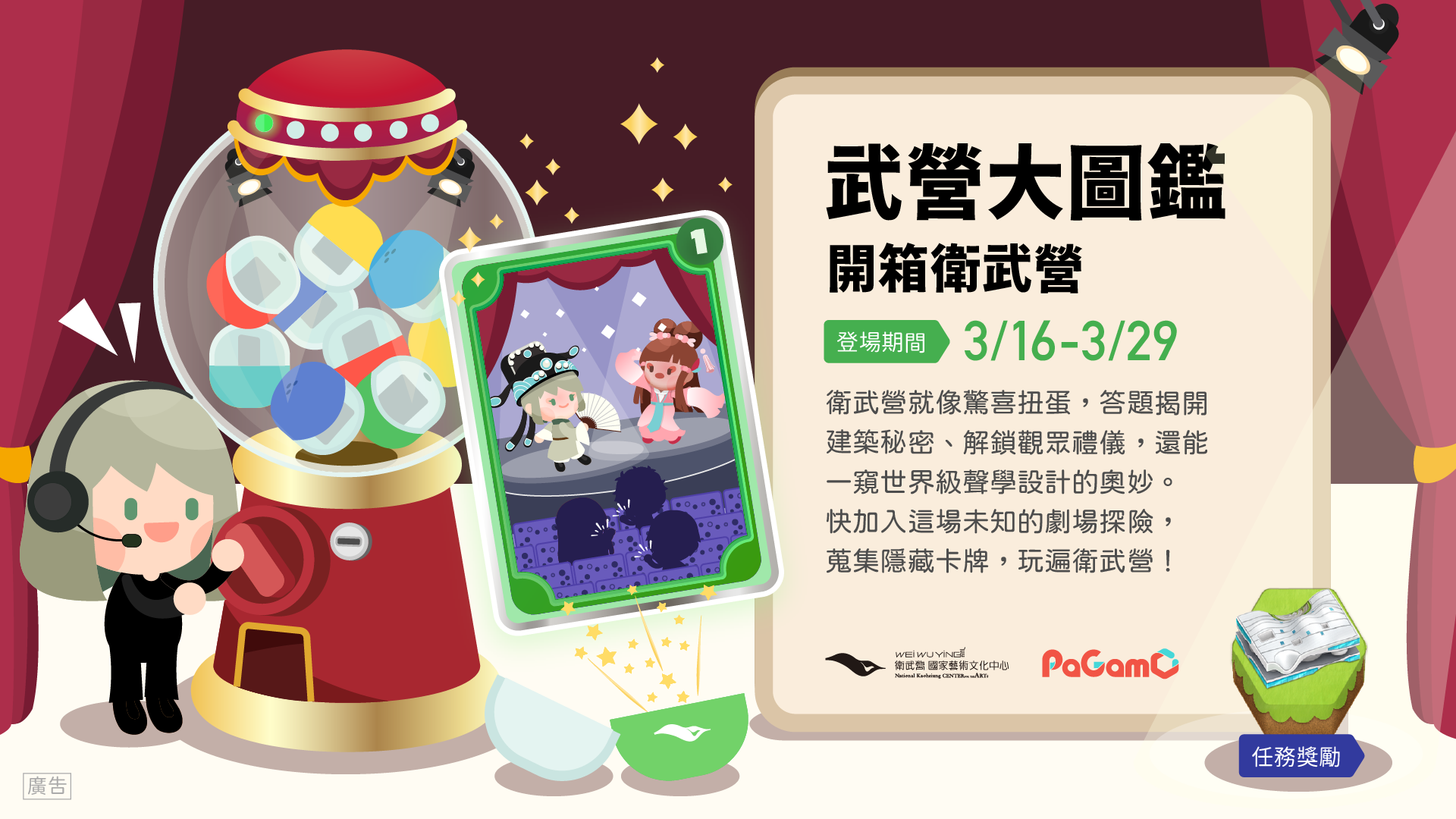 這次【武營大圖鑑】與 PaGamO 攜手合作,要帶領玩家們化身劇場探險家,在數位地圖上展開一場熱血的「開箱」旅程,透過答題,你將親手點亮那些藏在白色建築下的繽紛秘密!
